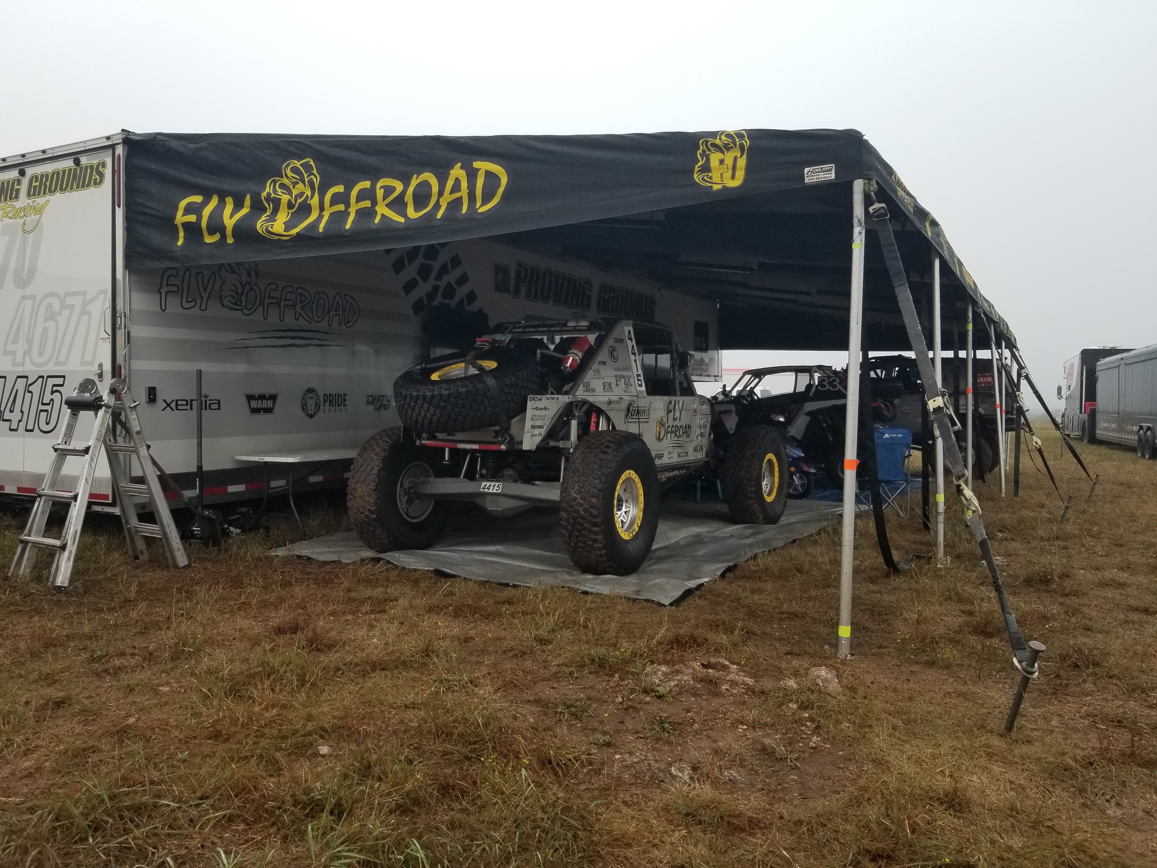 I made it out of A loop making good time, hit the short course and headed off to B loop. This is where things went wrong. As soon as I crested the hill to A loop, from the short course, my driver side tie rod spindle bolt sheared and put me in the brush. This was not a part I had. I radiod back in to the pits and let them know, I then ran back on foot to see what our options were. I made it back to pits with the part in hand and the Proving Grounds Racing team was running around the vendor area to find a part. No one had the exact part but we did find something that would get me to the pits so we could further assess.